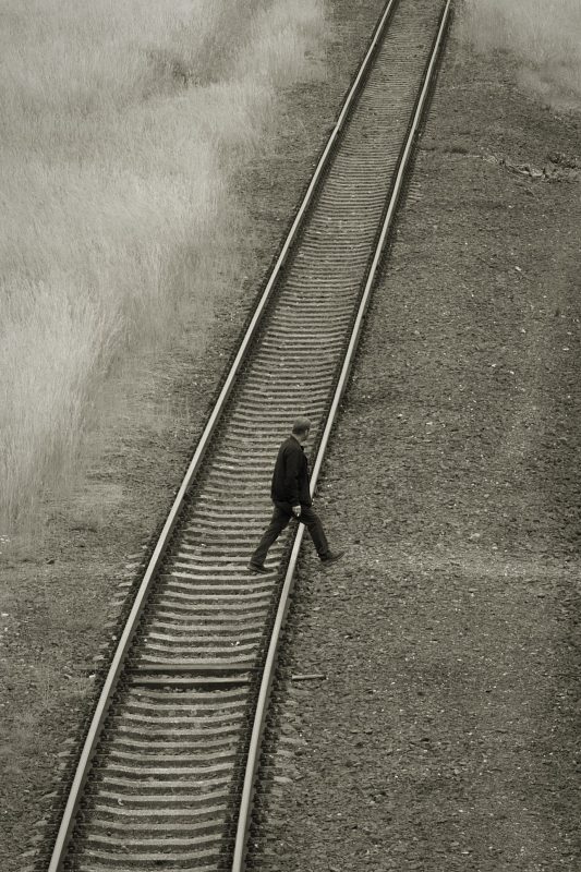 Description: Původní fotkou jsem chtěl zachytit daleko větší celek - koleje směřující k vlakové zastávce. Až při úpravě fotky jsem si všiml osoby překračující koleje a fotku jsem i tak ořízl. Upravil jsem ji do stylu starých černobílých filmů s lehkým nádechem sépiových tónů. S kombinací úpravy fotografie mě napadlo, že bych fotku nazval "Překročení hranice" - jak se dost lidí za bývalého režimu snažilo překročit, ale ne všem to vyšlo.