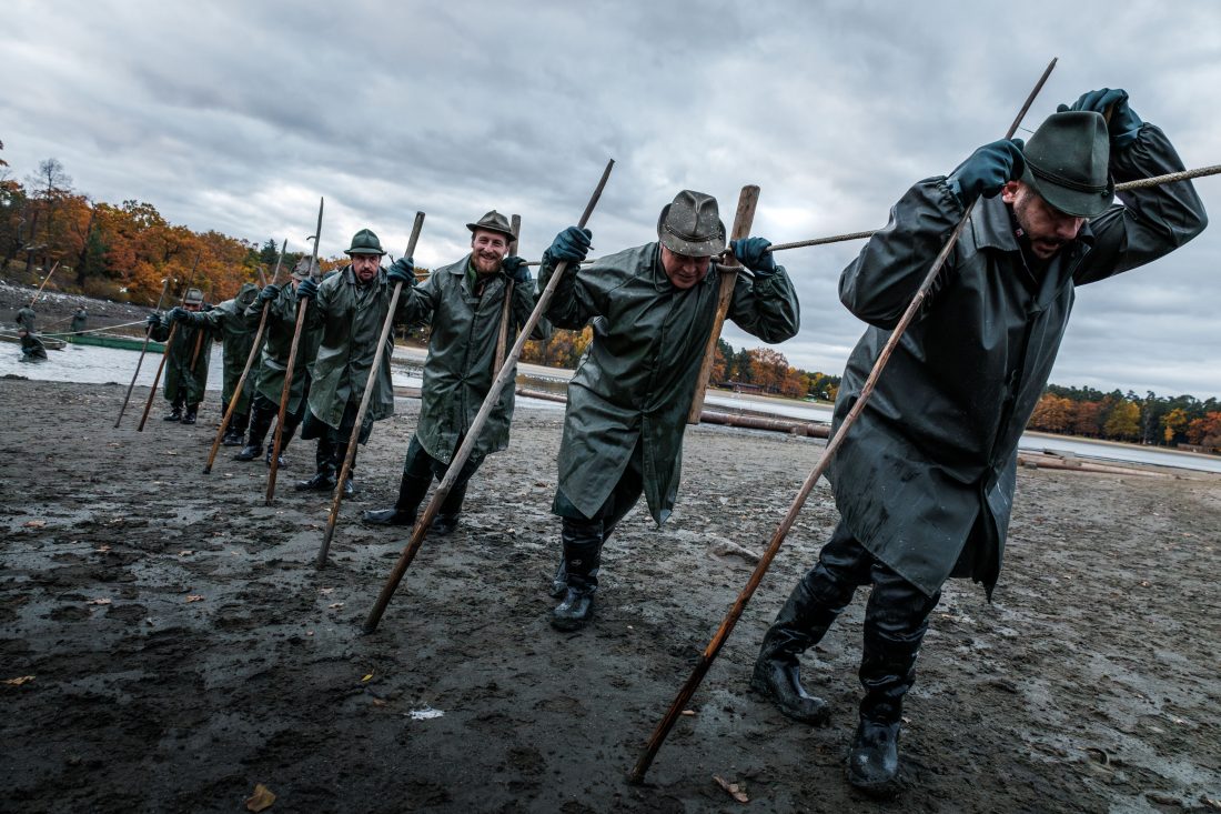 Description: Fotografie zachycuje výlov rybníku Bezdrev, při kterém se pěšáci brodí bahnitým terénem a vedou síť směrem k výpusti. Jde o fyzicky náročnou práci, která vyžaduje přesnost a spolupráci. Snímek dokumentuje tradiční postup, který se v regionu používá dlouhodobě a je součástí každoročního hospodaření na rybnících.